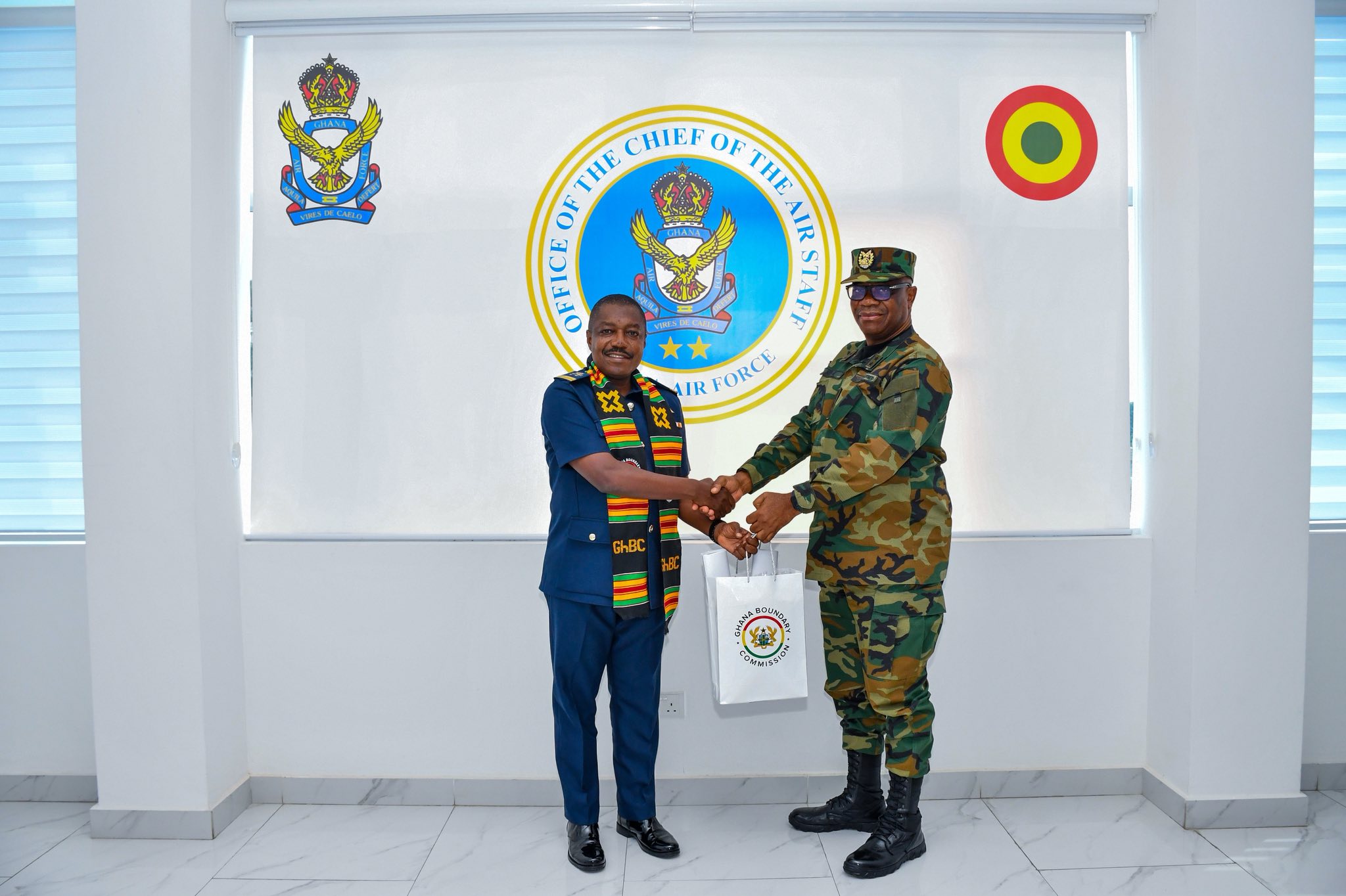The Commissioner-General of the Ghana Boundary Commission (GhBC), Major General Anthony Ntem paid a working visit to the Airforce Headquarters yesterday. The aim of the visit was to congratulate the Chief of Air Staff (CAS), Air Vice Marshall Agyen-Frempong, on his appointment and to also hold discussions on activities to be conducted in the year.